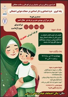 دوره امدادگر ورزشی با مجوز رسمی از سوی فدراسیون پزشکی ورزشی آغاز دوره 22 آذر مکان هیات پزشکی ورزشی هزینه دوره 5.800.000 تومان افرادی که تا قبل 15 آذر نسبت به ثبت نام اقدام کنند هزینه دوره 4.800.00 محاسبه می شود. جهت کسب اطلاعات بیشتر با شماره 09113860361 در واتساپ با ما درارتباط با شید