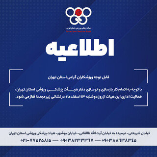 هیات پزشکی ورزشی استان تهران طی روزهای ۱۴ الی ۱۶ آبانماه، پوشش پزشکی مجموعهای از رقابتهای ورزشی در رشتههای مختلف را بر عهده داشت.