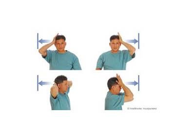 ۱- فرد روی صندلی نشسته، پشت سراو می ایستیم، با یک دست چانه وبادست دیگر سراورا گرفته ابتداء سر را بطرف مقابل خم کرده وسپس به آرامی به طرف مخالف می چرخانیم. فرد این حرکت را به کمک دستان خود نیز می تواند انجام دهد.