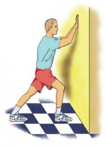 2-روبه دیوار به فاصله یک گام ایستاده ،کف دستها را به دیوار چسبانده و پایی را که دچار عارضه است به عقب بکشید تا جایی که پاشنه پا از زمین بلند نشود.