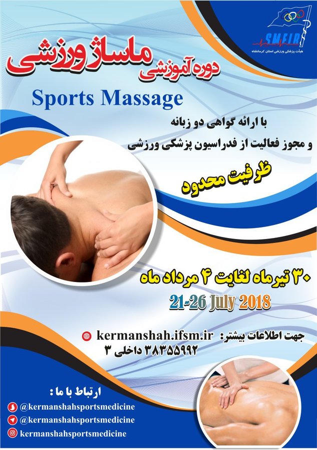 هیات پزشکی ورزشی کرمانشاه بر اساس برنامه اعلام شده از کمیته آموزش و پژوهش فدراسیون پزشکی ورزشی و مجوز شماره 2405 ، دوره آموزشی ماساژ ورزشی از تاریخ ٣٠ تیر ماه لغایت ٤ مرداد ماه برگزار می نماید.