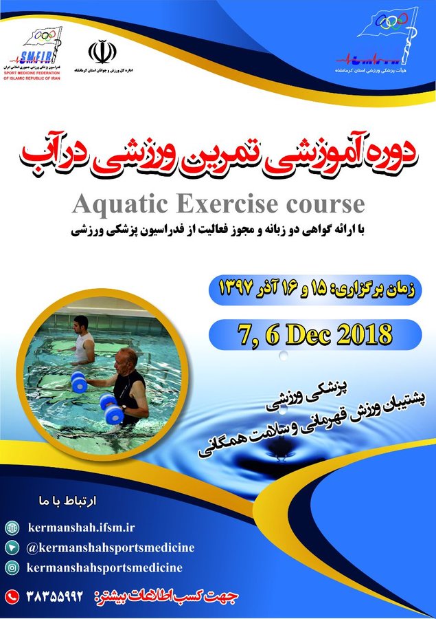 بر اساس اعلام کمیته آموزش فدراسیون پزشکی ورزشی دوره آموزشی تمرین در آب در روزهای پنج شنبه و جمعه پانزدهم و شانزدهم آذر ماه در کرمانشاه برگزار می شود.