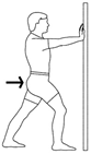 رو به دیوار ایستاده و هر دو دست حود را هم سطح چشمانتان روی دیوار قرار دهید. یک پا را عقب تر قرار دهید و پاشنه آن را به زمین بچسبانید. پای عقب تر را به سمت داخل بچرخانید و به آرامی به سمت دیوار خم شوید تا در پشت ران کشش را احساس کنید، ۱۵ تا ۳۰ ثانیه در همین حال بمانید. این حرکت را سه بار در هر پا تکرار کنید.