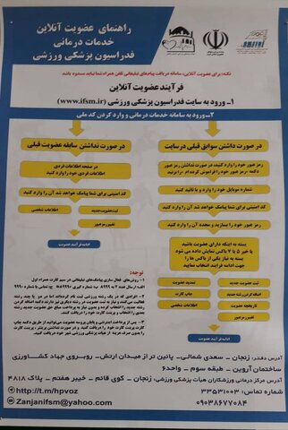 بیتا بدلخانی، دبیر هیات پزشکی ورزشی استان زنجان اظهار داشت: جهت حفظ سلامت متقاضیان و شکستن زنجیره کرونا ویروس ثبت نام بیمه ورزشی به صورت آنلاین انجام میگیرد. در این سامانه دارندگان کارت بیمه با استفاده از کد ملی به سهولت میتوانند ثبتنام و تمدید کارتهای بیمه ورزشی را انجام دهند و از طریق اینترنت به صورت ۲۴ ساعته به اطلاعات ثبت نامی خود دسترسی داشته باشند.