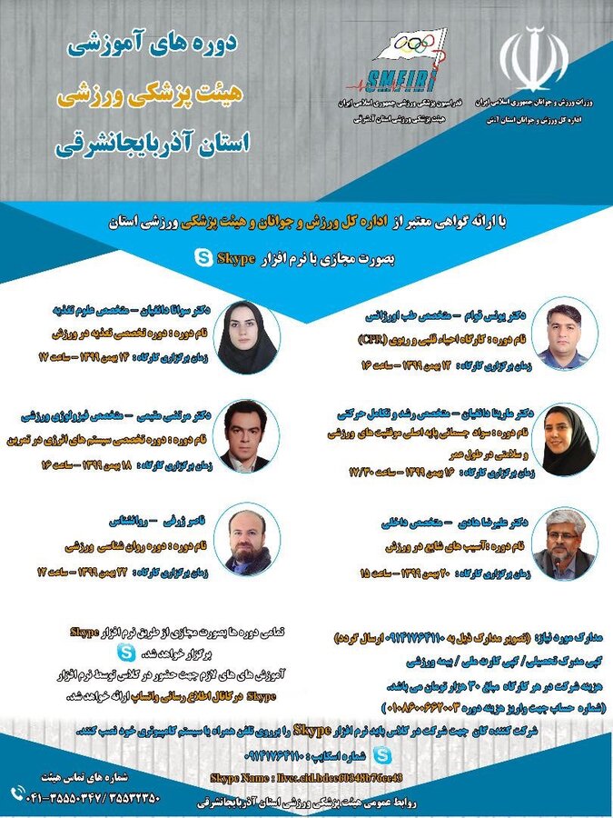 به گزارش دفتر آذربایجان شرقی پایگاه خبری تحلیلی پزشکی ورزشی ایران، ۶ دوره آموزشی هیات پزشکی ورزشی با عناوین دوره تخصصی تغذیه در ورزش، سواد جسمانی پایه اصلی موفقیت های ورزشی و سلامتی در طول عمر، سیستم های انرژی در تمرین، آسیب های شایع در ورزش، روانشناسی ورزشی و احیای قلبی و ریوی(CPR) توسط اساتید متخصص در حیطه های مربوطه به ترتیب اعلام دوره ها دکتر سوانا دانغیان متخصص علوم تغذیه، دکتر مارینا دانغیان متخصص رشد و تکامل حرکتی، دکتر مرتضی مقیمی متخصص فیزیولوژی ورزشی، دکتر علیرضا هادی متخصص داخلی، ناصر ژرفی دانشجوی دکتری روانشناسی، دکتر یونس قوام متخصص طب اورژانس به صورت آنلاین در بهمن ماه جاری برگزار شد.