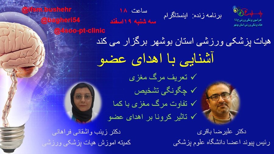 هیات پزشکی ورزشی استان بوشهر برنامه زنده ، بررسی و آشنایی با اهدای عضو را روز سه شنبه 19 اسفند ماه راس ساعت 18 در فضای مجازی و پخش زنده در اینستاگرام برگزار می کند.