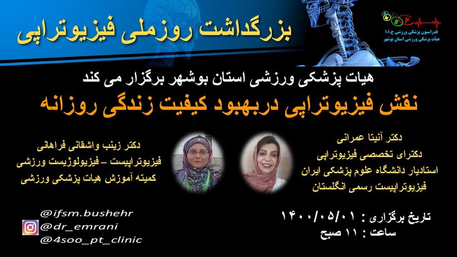 هیات پزشکی ورزشی استان بوشهر برنامه زنده نقش فیزیوتراپی در بهبود کیفیت زندگی روزانه را روز جمعه اول مرداد ماه راس ساعت 11 صبح در فضای مجازی و پخش زنده در اینستاگرام برگزار می کند.