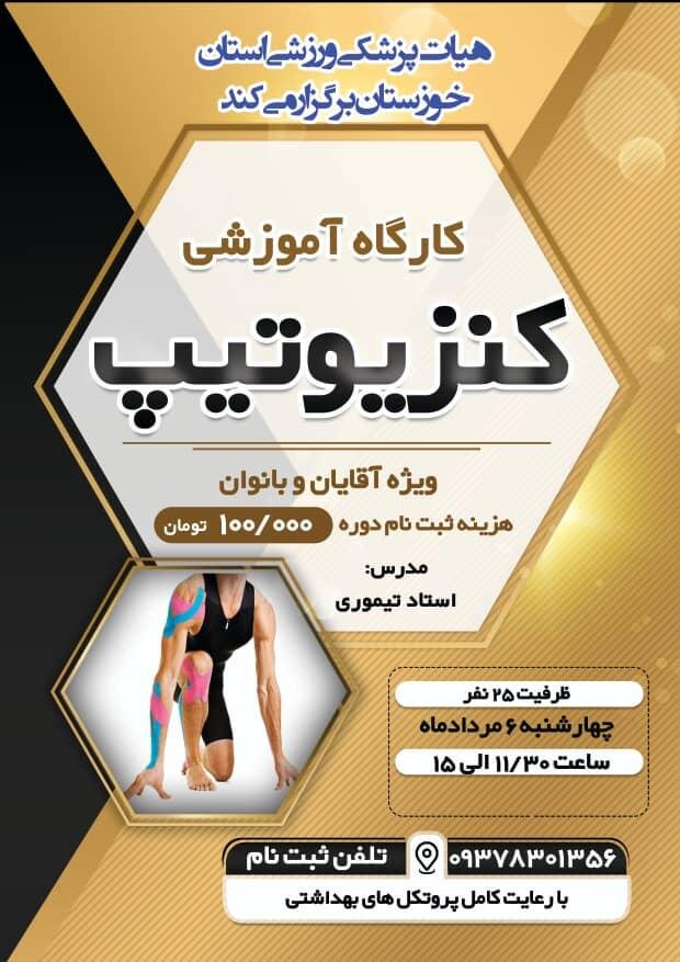 هیات پزشکی و ورزشی استان خوزستان درنظر دارد کارگاه آموزشی کنزیوتیپ را در روز چهارشبه 6 مرداد ماه از ساعت11:30 الی 15 برگزار کند.