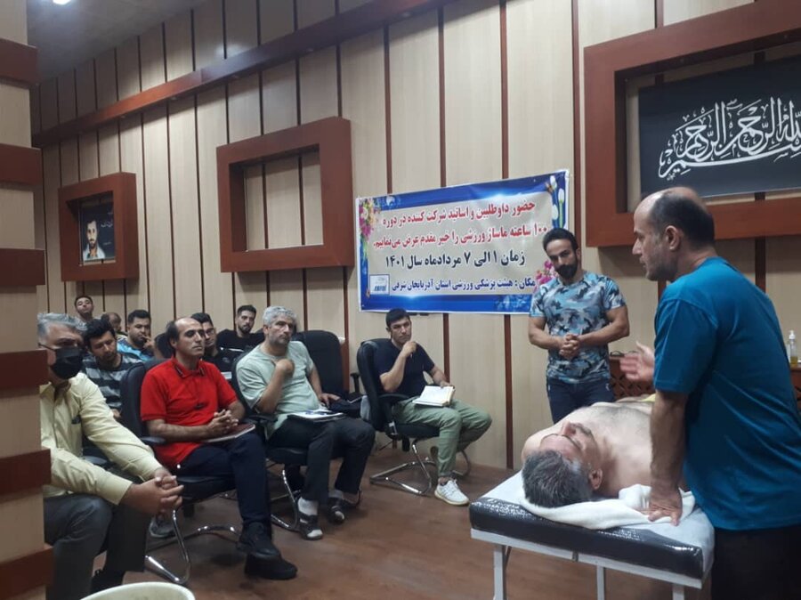 به گزارش روابط عمومی هیات پزشکی ورزشی استان آذربایجان شرقی:این دوره با حضور۳۲ نفر شرکت کننده بانوان و آقایان و با تدریس اساتید ماساژ ورزشی  فدراسیون پزشکی ورزشی به مدت یک هفته از تاریخ ۱۴۰۱/۰۵/۰۱ الی ۱۴۰۱/۰۵/۰۷ در محل هیات پزشکی ورزشی استان  برگزار شد.