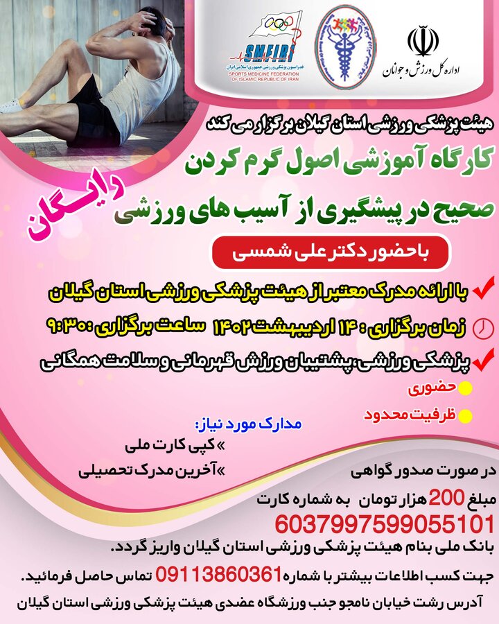 مدرس: دکتر علی شمسی با ارائه گواهی معتبر از هیئت پزشکی ورزشی استان گیلان برگزار نماید.جهت کسب اطلاعات بیشتر با
