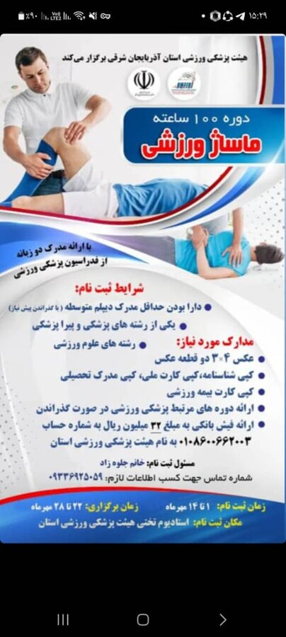 واجدین شرایط و علاقمندان می توانند جهت ثبت نام در این دوره بصورت حضوری در هیئت پزشکی ورزشی حضور یافته و برای اطلاعات بیشتر با شماره تلفنهای داده شده در پوستر تماس حاصل نمایند.