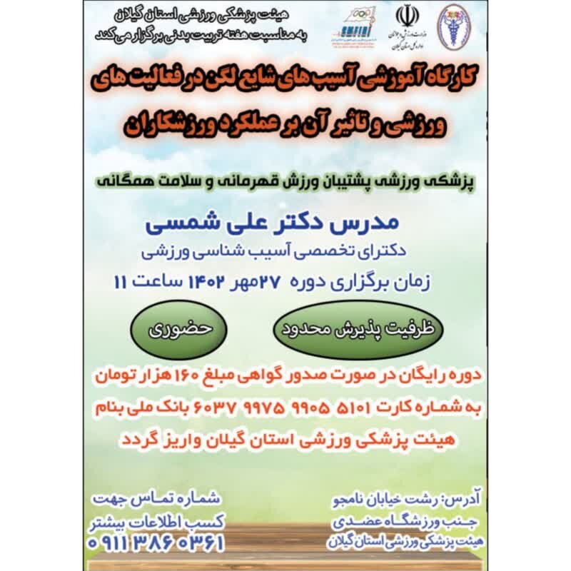 با تدریس : دکتر علی شمسی دکترای تخصصی آسیب شناسی ورزشی با ارائه گواهی معتبر از هیئت پزشکی ورزشی استان گیلان برگزار نماید.