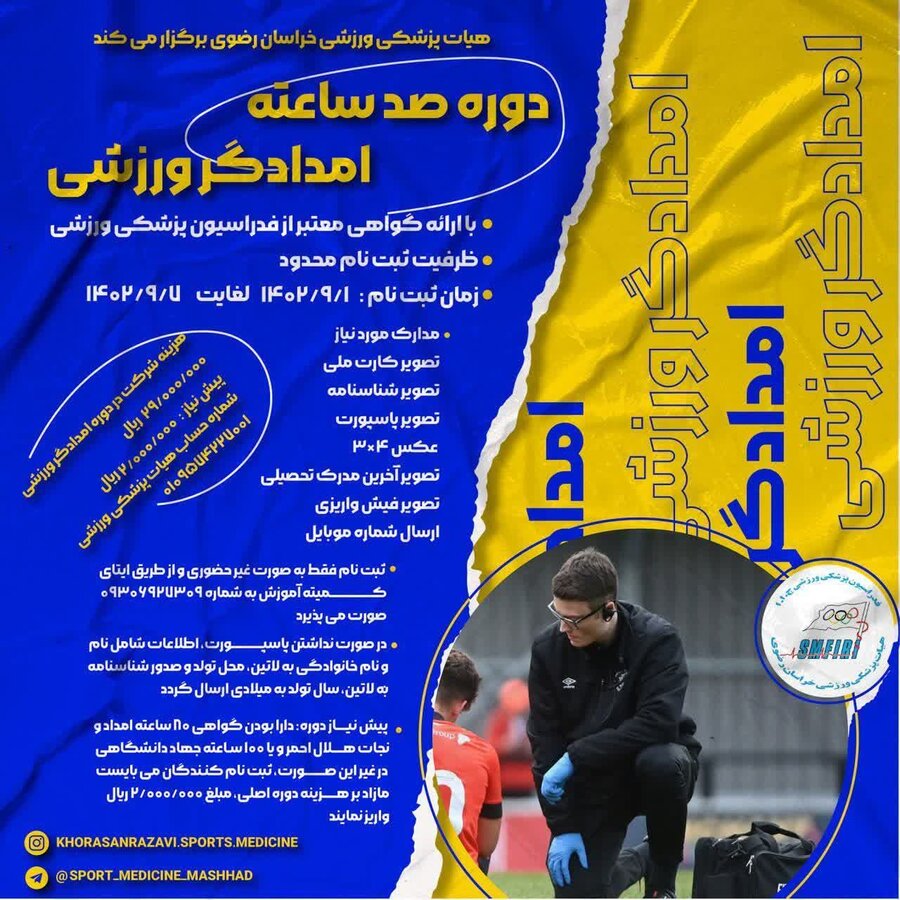 به گزارش دفتر استان خراسان رضوی پایگاه خبری تحلیلی پزشکی ورزشی ایران، ثبت نام دوره صد ساعته امدادگر ورزشی آغاز شد .