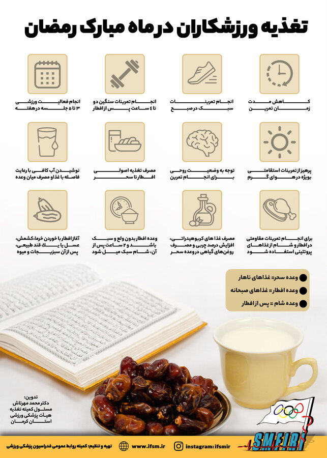 - در هفته می توانید 3 تا 5 جلسه ورزش کنید سعی شود شدت ها را کاهش داده و تغذیه افطار تا سحر را با دقت پیگیری نمایید.