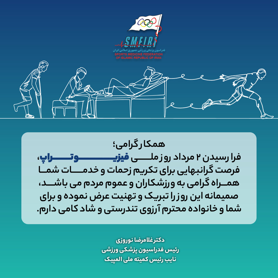 خبر ستادی سهشنبه ۲ مرداد ۱۴۰۳ - ۱۳:۱۸ ۲ مرداد؛روز ملی فیزیوتراپ گرامی باد فدراسیون پزشکی ورزشی فرا رسیدن ۲ مرداد روز ملی فیزیوتراپ را خدمت تمام همکاران این عرصه بویژه عزیزان همکار در ستاد مرکزی و هیات های استانی این فدراسیون تبریک عرض می نماید. ارسال نظر شما در حال ارسال پاسخ به نظر « » میباشید. × لغو پاسخ نمایش ایمیل شما