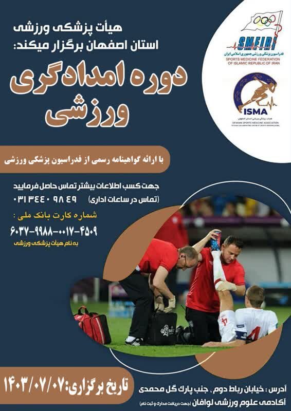 دوره امدادگری ورزشی با اعطای گواهی رسمی از فدراسیون پزشکی ورزشی، توسط هیات پزشکی ورزشی استان اصفهان برگزار می شود.