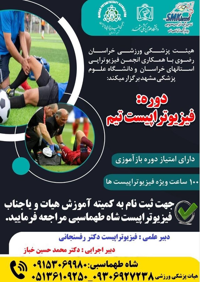 به گزارش دفتر استان خراسان رضوی پایگاه خبری تحلیلی پزشکی ورزشی ایران، دوره های تربیت فیزیوتراپیست تیم، از دیرباز به عنوان مهم ترین دوره تخصصی ویژه فیزیوتراپیست های ورزشی محسوب می گردد که متولی برگزاری آن، فدراسیون پزشکی ورزشی جمهوری اسلامی ایران می باشد.
