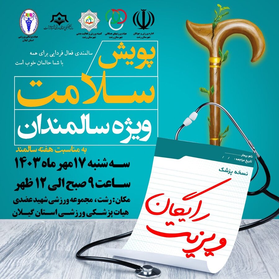 به گزارش روابط عمومی هیات پزشکی ورزشی استان گیلان،  بمناسبت  هفته تکریم و منزلت سالمندان با شعار «سالمندی فعال فردایی برای همه» مورخ ۱۷ مهرماه راس ساعت 9الی 12با همکاری هیات ورزش های همگانی شهرستان رشت ،کمیته سالمندان شهرستان رشت ،سازمان فرهنگی ورزشی اجتماعی شهرداری رشت در هیات پزشکی ورزشی استان گیلان برگزار می گردد.