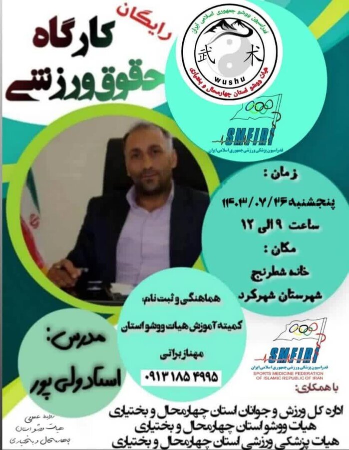 به گزارش دفتر چهار محال و بختیاری پایگاه خبری تحلیلی پزشکی ورزشی ایران مینا مختاری گفت : به مناسبت هفته تربیت بدنی کارگاه آموزشی رایگان حقوق ورزشی ویژه مربیان و مسئولین باشگاهها با همکاری هیات ووشو واداره کل ورزش و جوانان در بیست و ششم مهرماه در خانه شطرنج شهرکرد با تدریس استاد ولی پور کارشناس حقوق ورزشی برگزار می شود