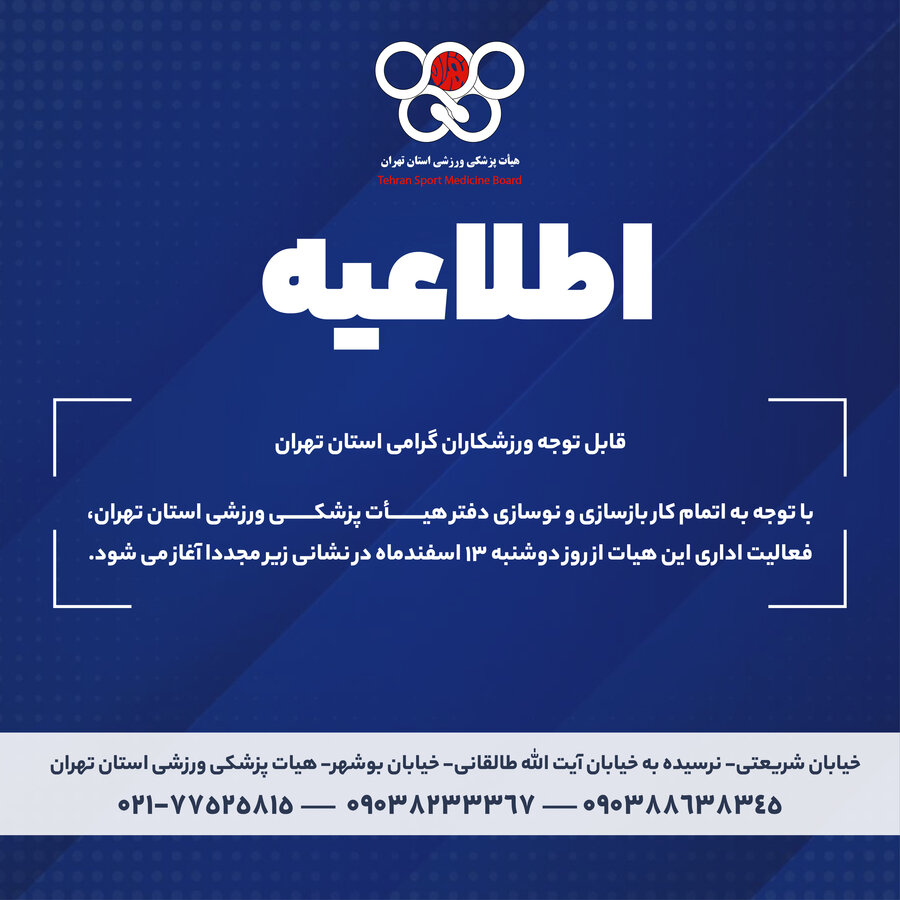 از سرگیری فعالیت دفتر اداری هیات پزشکی ورزشی استان تهران در خیابان بوشهر