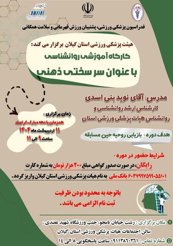 به گزارش روابط عمومی هیات پزشکی استان گیلان کمیته آموزش این هیات همزمان با دهه مبارک کرامت در نظر دارد کارگاه روانشناسی را باعنوان سرسختی ذهنی با هدف بازیابی روحیه حین مسابقه را 11 اردیبهشت سال جاری از ساعت 9 به مدت 2ساعت به صورت رایگان در محل سالن اجتماعات هیات پزشکی ورزشی برگزار کند