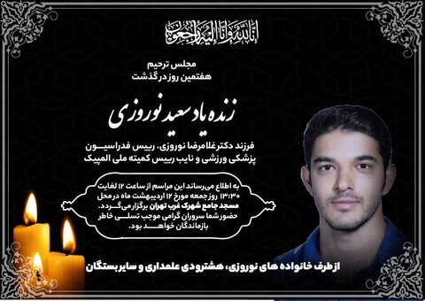 خبر ستادی یکشنبه ۷ اردیبهشت ۱۴۰۴ - ۱۹:۲۳ اعلامیه مجلس ترحیم هفتم درگذشت شادروان سعید نوروزی، فرزند جناب آقای دکتر غلامرضا نوروزی در تهران روز جمعه ۱۲ اردیبهشت از ساعت ۱۲ لغایت ۱۳ و ۳۰ دقیقه مسجد جامع شهرک غرب تهران ارسال نظر شما در حال ارسال پاسخ به نظر « » میباشید. × لغو پاسخ نمایش ایمیل شما
