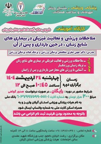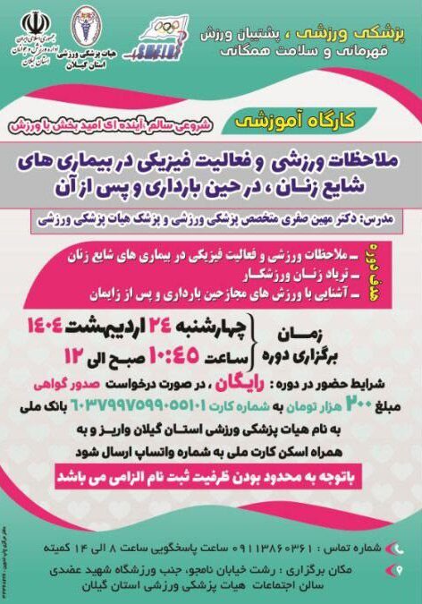 کمیته آموزش هیات پزشکی ورزشی استان گیلان در نظر دارد در راستای برنامه های آموزشی خود کارگاه آموزشی ملاحظات ورزشی و فعالیت فیزیکی در بیماری های شایع زنان ، در حین بارداری و پس از آن(حضور در دوره رایگان می باشد)
