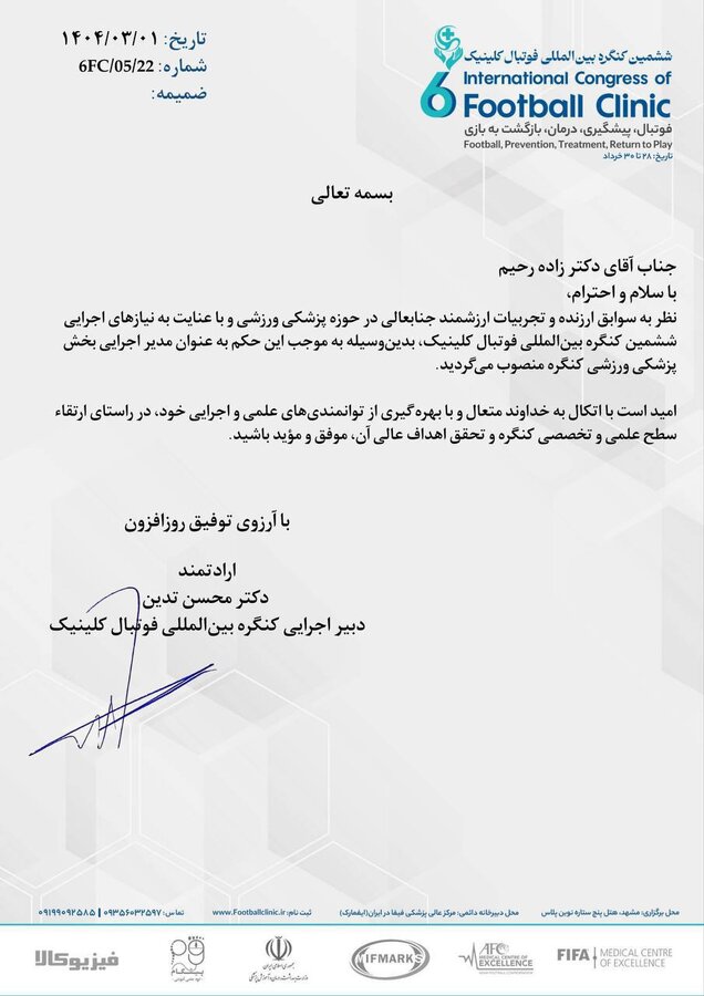 به گزارش دفتر استان خراسان رضوی پایگاه خبری تحلیلی پزشکی ورزشی ایران، طی حکمی از سوی دبیر اجرایی کنگره دکتر زاده رحیم به عنوان مدیر اجرایی پزشکی ورزشی ششمین کنگره فوتبال کلینیک منصوب شد.