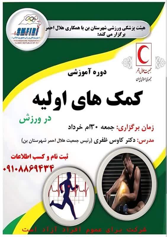 به گزارش دفتر چهار محال و بختیاری پایگاه خبری تحلیلی پزشکی ورزشی ایران ، هیات پزشکی ورزشی شهرستان بن در نظر دارد دوره آموزشی کمک های اولیه در ورزش ویژه مربیان ورزشی را با همکاری جمعیت هلال احمر شهرستان و با تدریس دکتر کاوس ظفری برگزار نماید