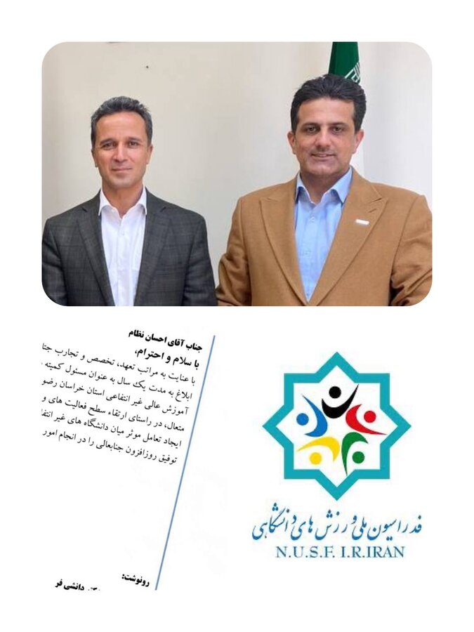 طی حکمی از سوی دکتر سید علیرضا حسینی کاخک رئیس هیات ورزشهای دانشگاهی خراسان رضوی، سید احسان نظام(دبیر هیات پزشکی ورزشی استان) به عنوان رئیس کمیته تربیت بدنی و ورزش دانشگاهها و موسسات آموزش عالی غیرانتفاعی استان خراسان رضوی منصوب شد.