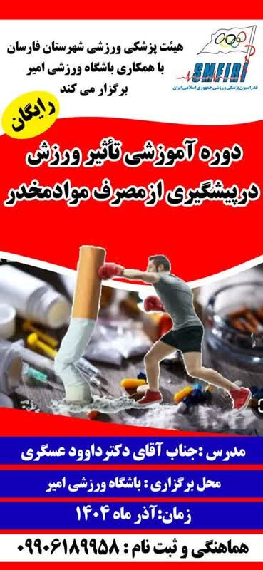 به گزارش دفتر چهار محال و بختیاری پایگاه خبری تحلیلی پزشکی ورزشی ایران ، هیات پزشکی ورزشی شهرستان فارسان در نظر دارد دوره آموزشی تاثیر ورزش در پیشگیری از مصرف مواد مخدر با تدریس دکتر داود عسگری مدرس دانشگاه را در سوم آذرماه به صورت رایگان ویژه ورزشکاران در محل باشگاه برگزار نماید.