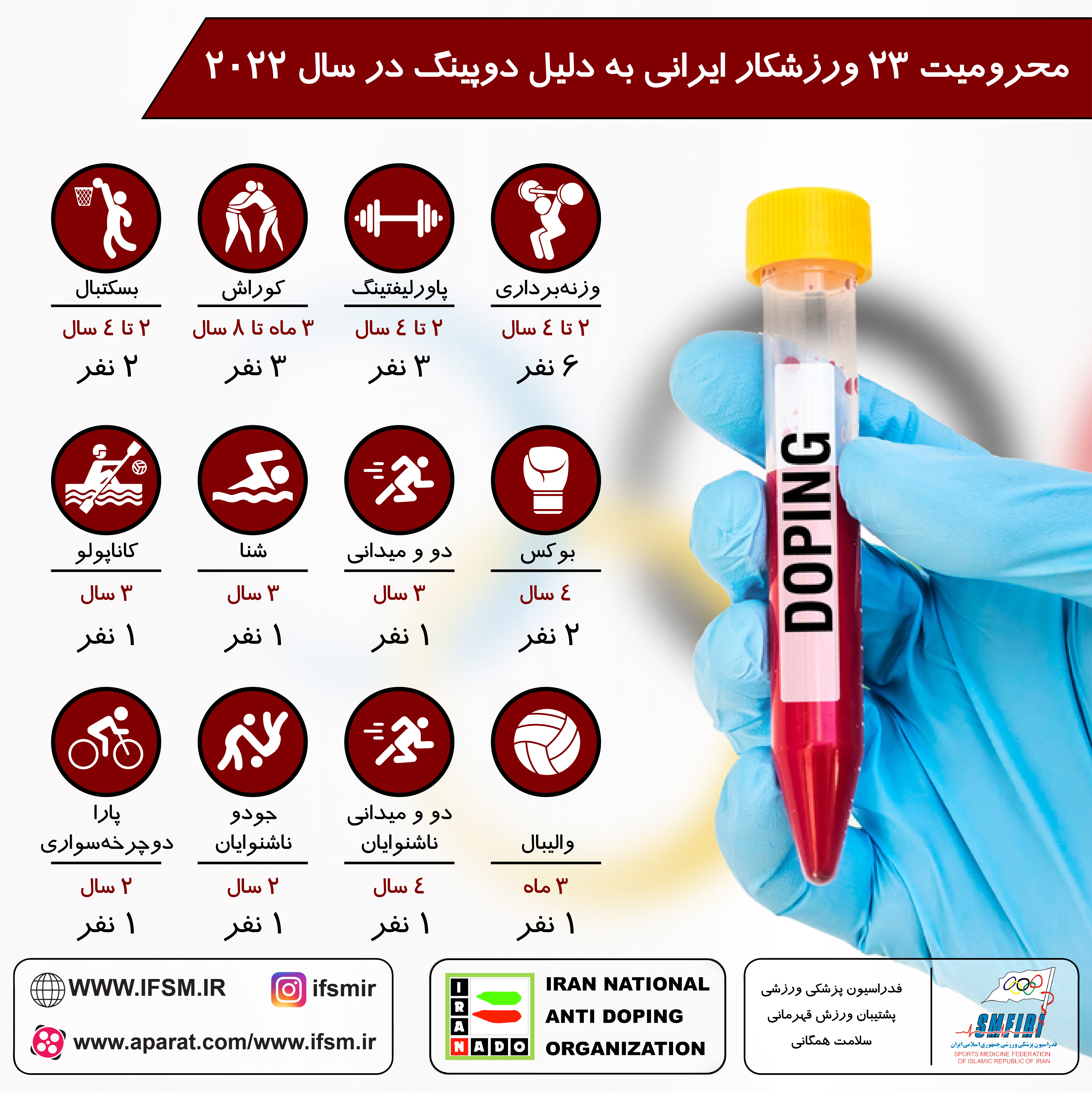 محرومیت ۲۳ ورزشکار در سال ۲۰۲۲ به دلیل تخلف دوپینگ