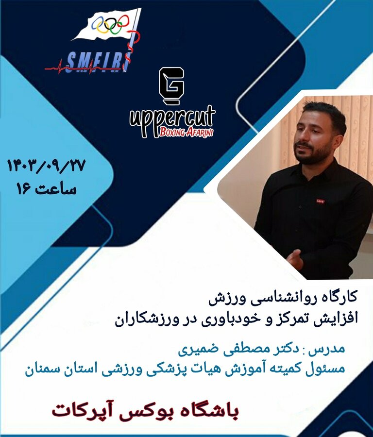 این کارگاه ویژه هیات بوکس آپرکات با تدریس مصطفی ضمیری،مدرس و رئیس کمیته آموزش هیات پزشکی ورزشی استان سمنان با ۱۷ شرکت کننده ۲ نفر خانم و۱۵ نفر آقا در محل سالن آموزش هیات استان برگزار گردید.